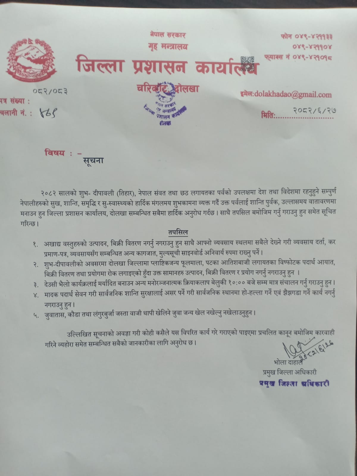 तिहार पर्वलाई शान्तिपूर्ण र उल्लासमय वातावरणमा मनाउन जिल्ला प्रशासन कार्यालय दोलखाले विशेष सूचना जारी गरेको छ । प्रमुख जिल्ला अधिकारी भोला दाहालद्वारा प्रकाशित विज्ञप्तिमा पर्व मनाउँदा मर्यादा कायम राख्न सबै नागरिकलाई आग्रह गरिएको छ ।