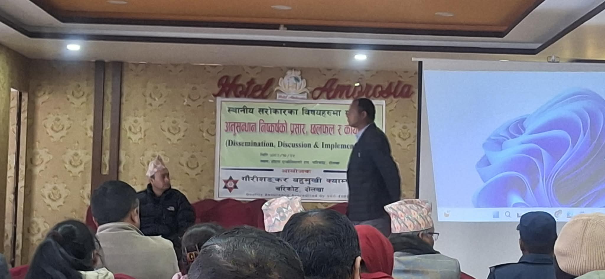अनुसन्धान सार्वजनिक कार्यक्रम अनुसन्धान टोलीका संयोजक नारायण प्रसाद सेढाईको अध्यक्षता तथा बागमती प्रदेशका वन तथा वातावरण मन्त्री भरत बहादुर केसीको प्रमुख आतिथ्यतामा सम्पन्न भएको थियो । कार्यक्रममा भीमेश्वर नगरपालिकाका उपप्रमुख कमला बस्नेत, गौरीशंकर बहुमुखी क्याम्पस सञ्चालक समितिका सदस्य रमेश खतिवडा लगायतले मन्तव्य व्यक्त गर्नुभएको थियो ।